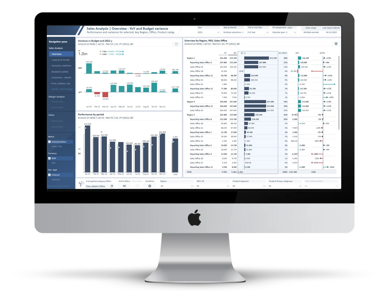 P&L zarządczy, marże, cash bridge, kapitał obrotowy i jego składowe, odchylenia vs budżet/forecast/PY, przekroje (produkt/klient/oddział) i inne analizy dostosowane do potrzeb i modelu biznesowego.